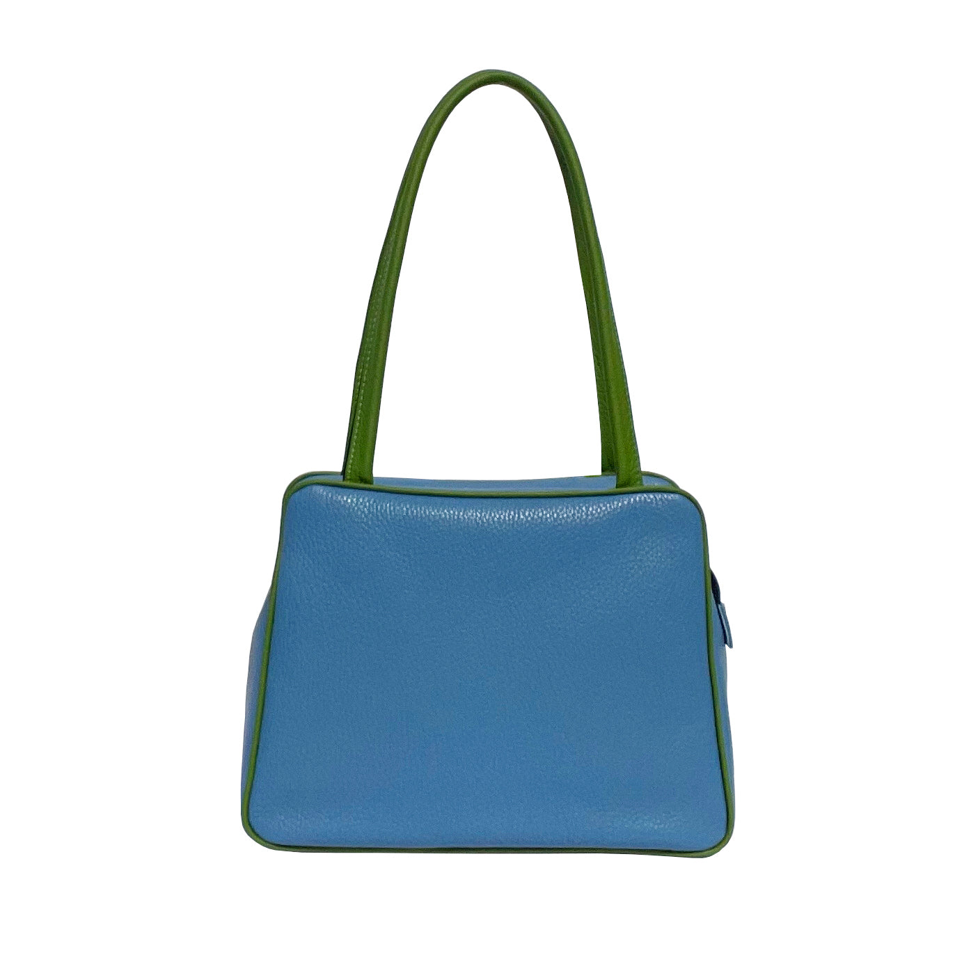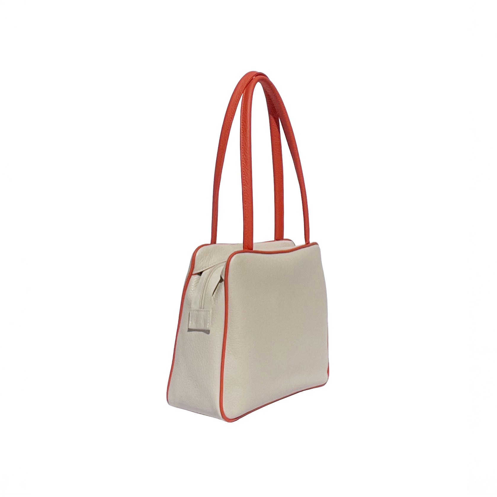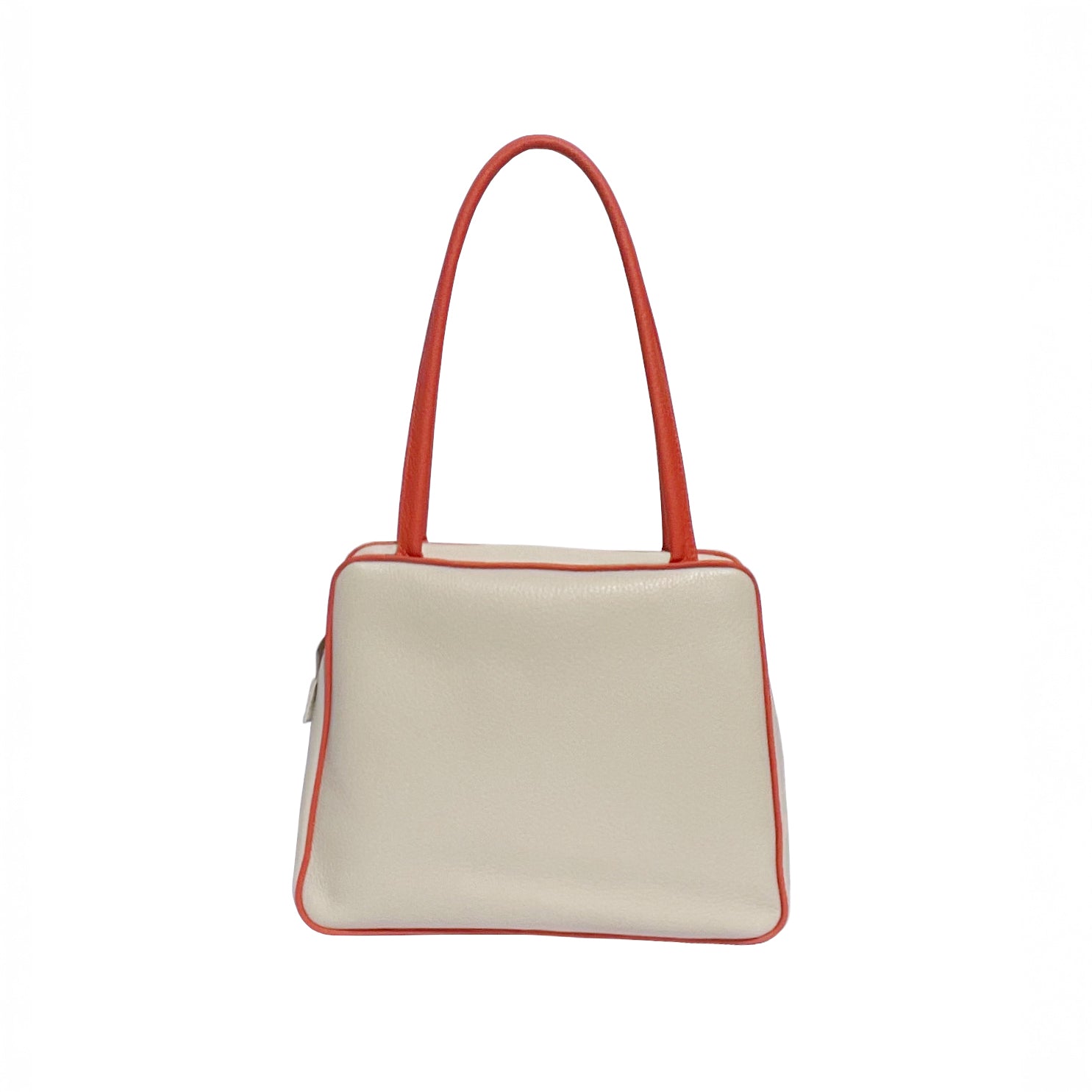 Kleine weiche Handtasche im Bowling-Stil mit schulterlangen Rundriemen in einer 2 Farbkombination.